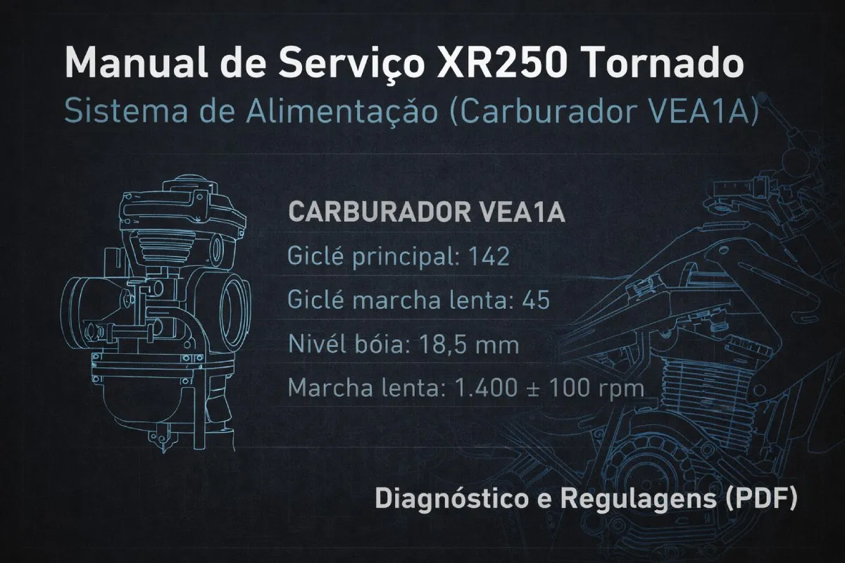 Importante: este PDF não traz um “ano” impresso nas páginas desta seção. A forma correta de confirmar aplicabilidade é checar se a sua XR250 é Tornado carburada e se o carburador corresponde ao VEA1A e às especificações acima.
